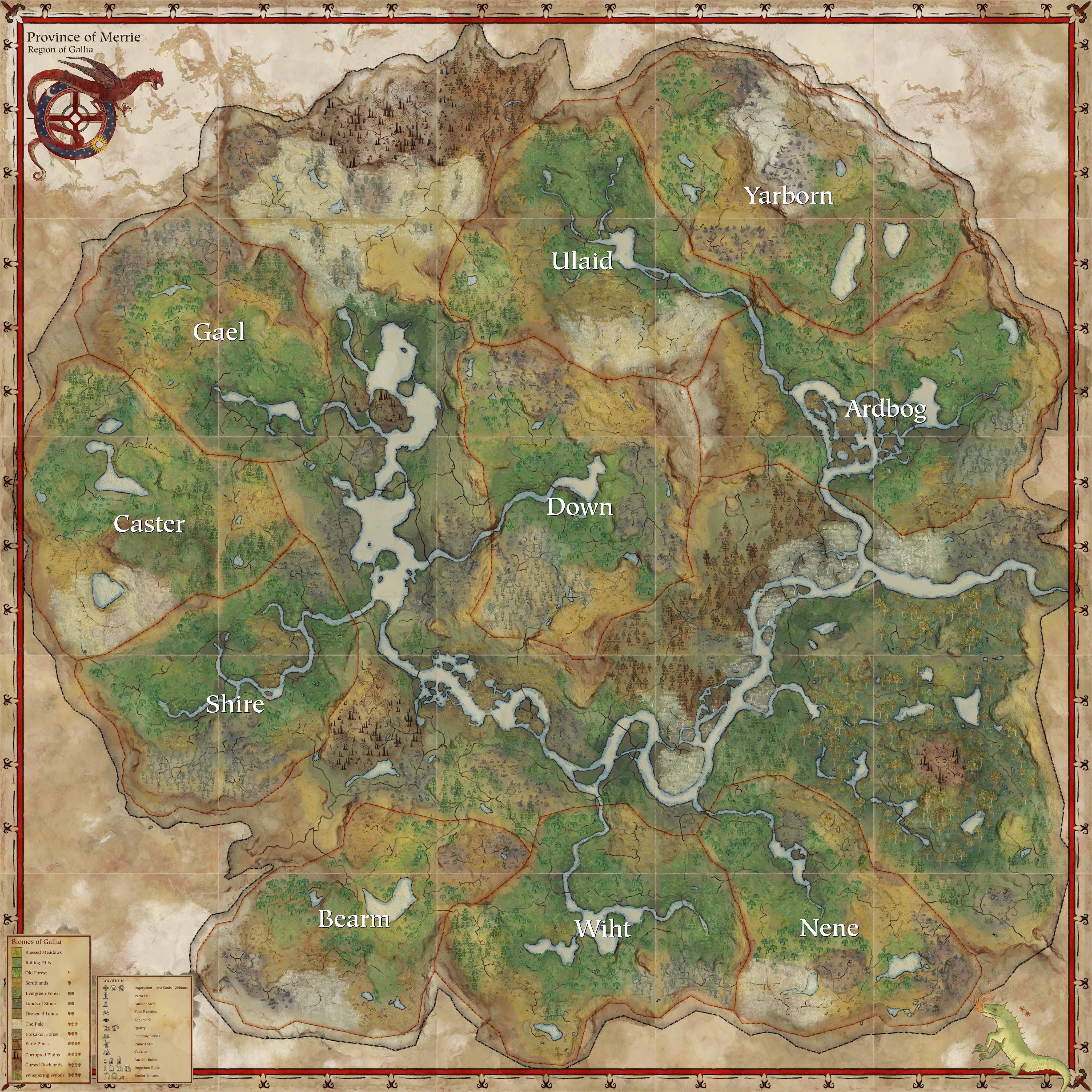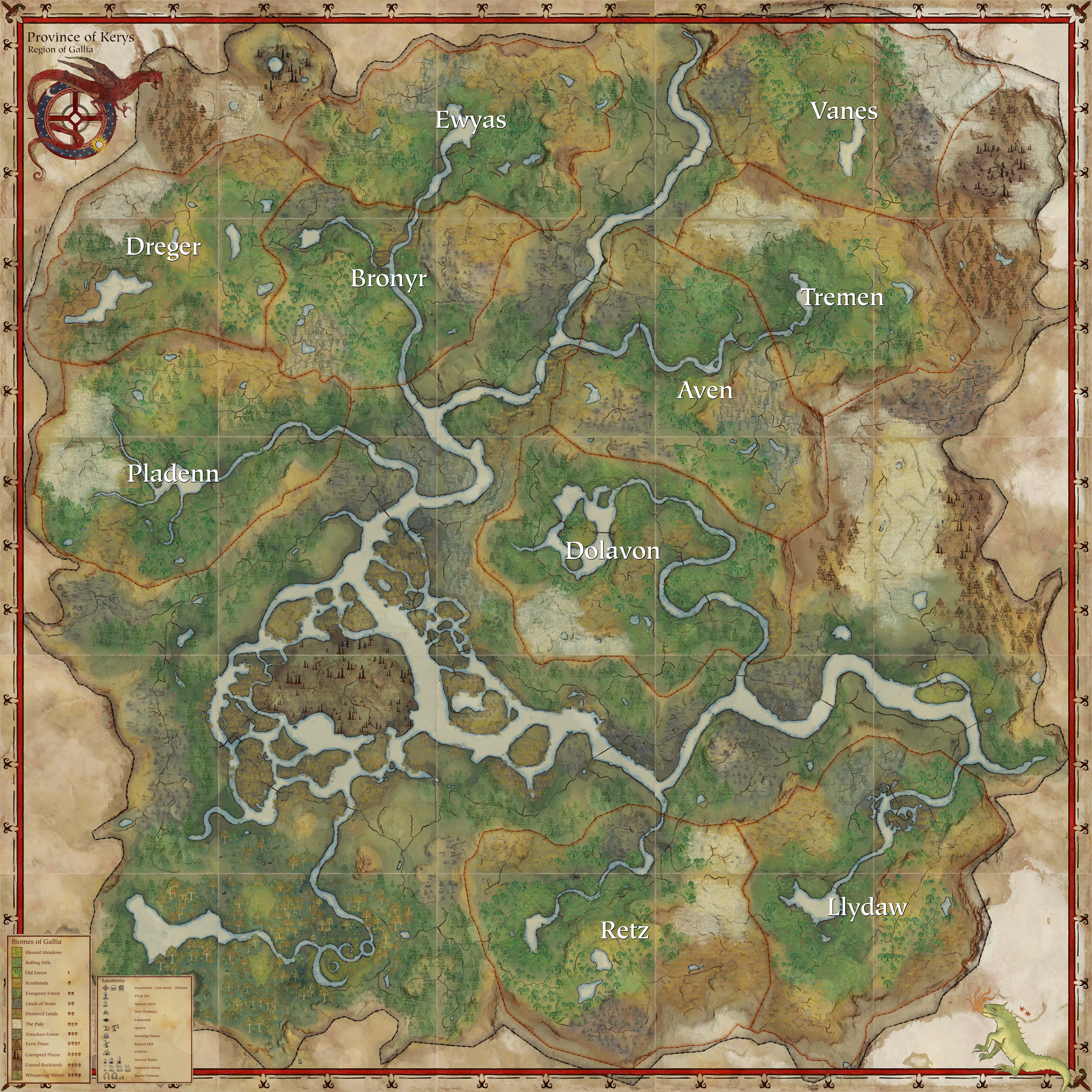 Diese Regionen bilden die Eckpfeiler der Spielwelt. Jede Region ist wiederum in mehrere Provinzen untergliedert.
