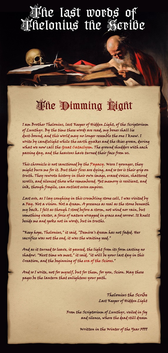Ich bin Bruder Thelonius, der letzte Hüter des Verborgenen Lichts, aus dem Scriptorium von Lunthyr. Bis die Worte, die ich hier schreibe, gelesen werden, werden meine Knochen staubig geworden sein, und diese Welt wird vielleicht nicht mehr der gleichen ähneln, die ich einst kannte. Ich schreibe im Schein einer Kerze, während die Erde bebt und der Himmel stöhnt, in einer Zeit, die wir nun die Große Katastrophe nennen. Der Boden zittert mit jedem vergehenden Tag, und der Himmel hat sein Gesicht von uns abgewandt.