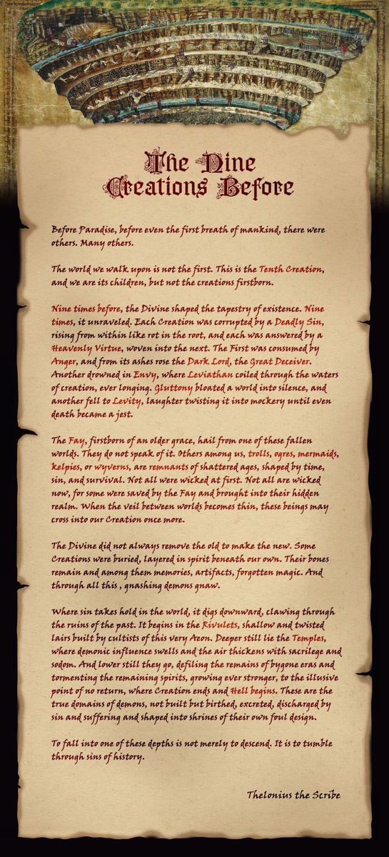 Neun Mal zuvor formte das Göttliche das Gewebe der Existenz. Neun Mal zerbrach es. Jede Schöpfung wurde von einer Todsünde korrumpiert, die von innen heraus wie Fäulnis an der Wurzel emporstieg, und jede wurde von einer Himmlischen Tugend beantwortet, die in die nächste eingeflochten wurde. Die Erste wurde von Zorn verzehrt, und aus ihrer Asche stieg der Dunkle Lord, der Große Verführer. Eine andere ertrank in Neid, wo Leviathan durch die Gewässer der Schöpfung schlich, stets sehnend. Völlerei blähte eine Welt in die Stille, und eine andere fiel in Leichtigkeit, wobei das Lachen sie in Hohn verwandelte, bis sogar der Tod zum Scherz wurde.