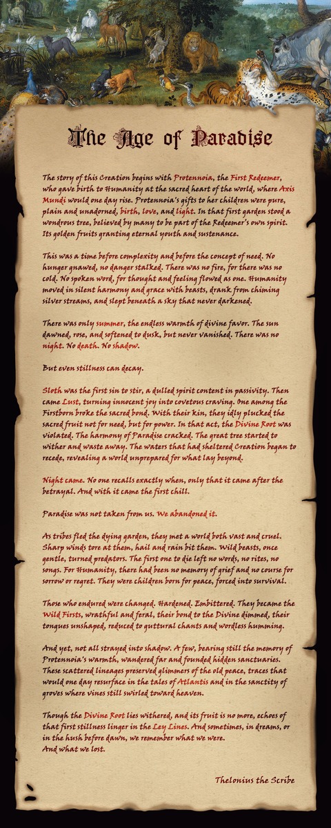 Die Geschichte dieser Schöpfung beginnt mit Protennoia, der Ersten Erlöserin, die die Menschheit im heiligen Herzen der Welt gebar, wo eines Tages der Axis Mundi emporsteigen würde. Protennoias Gaben an ihre Kinder waren rein, schlicht und ungeschmückt: Geburt, Liebe und Licht. In jenem ersten Garten stand ein wundersamer Baum, von dem viele glaubten, er sei Teil des Geistes der Erlöserin. Seine goldenen Früchte gewährten ewige Jugend und Nahrung.